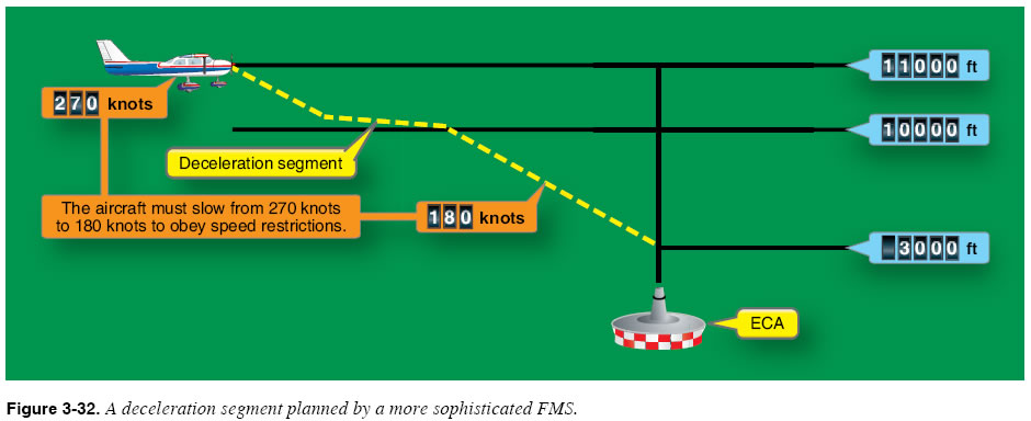 Some sophisticated FMSs are able to build in a deceleration segment that can allow the aircraft to slow from the cruise speed to the desired end-of-descent speed during the descent. This type of navigation system allows you to maintain the cruise speed up until the top-of-descent point and calculates the deceleration simultaneously with the descent. A deceleration segment is illustrated in Figure 3-32.