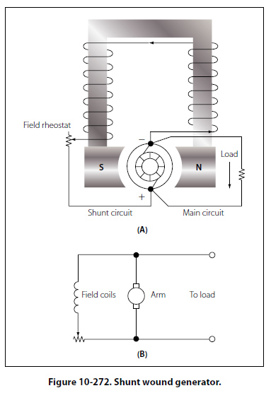 A generator having a field winding connected in parallel with the external circuit is called a shunt generator, as shown in views A and B of Figure 10-272. The field coils of a shunt generator contain many turns of small wire; the magnetic strength is derived from the large number of turns rather than the current strength through the coils. If a constant voltage is desired, the shunt wound generator is not suitable for rapidly fluctuating loads. Any increase in load causes a decrease in the terminal or output voltage, and any decrease in load causes an increase in terminal voltage; since the armature and the load are connected in series, all current flowing in the external circuit passes through the armature winding. Because of the resistance in the armature winding, there is a voltage drop (IR drop = current × resistance). As the load increases, the armature current increases and the IR drop in the armature increases. The voltage delivered to the terminals is the difference between the induced voltage and the voltage drop; therefore, there is a decrease in terminal voltage. This decrease in voltage causes a decrease in field strength, because the current in the field coils decreases in proportion to the decrease in terminal voltage; with a weaker field, the voltage is further decreased. When the load decreases, the output voltage increases accordingly, and a larger current flows in the windings. This action is cumulative, so the output voltage continues to rise to a point called field saturation, after which there is no further increase in output voltage.