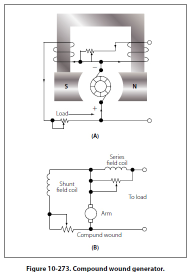 A compound wound generator combines a series winding and a shunt winding in such a way that the characteristics of each are used to advantage. The series field coils are made of a relatively small number of turns of large copper conductor, either circular or rectangular in cross section, and are connected in series with the armature circuit. These coils are mounted on the same poles on which the shunt field coils are mounted and, therefore, contribute a magnetomotive force which influences the main field flux of the generator. A diagrammatic and a schematic illustration of a compound wound generator is shown in A and B of Figure 10-273.