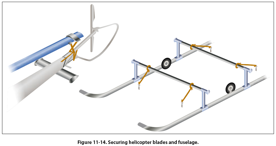 • Align the blades and install tiedown assemblies as prescribed by the helicopter manufacturer. [Figure 11-14] Tie straps snugly without strain, and during wet weather, provide some slack to avoid the possibility of the straps shrinking, causing undue stresses on the aircraft and/or its rotor system(s).