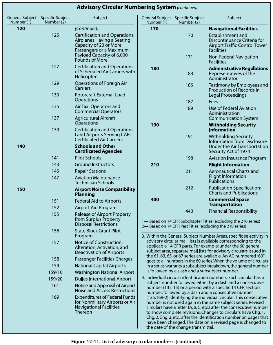 They are issued and updated irregularly with new revisions designated by letters of the alphabet. The suffix following an AC number indicates a revision to that AC and cancels the previous edition. For example, AC 00- 6A replaces and cancels AC 00-6; AC 00-7D replaces and cancels AC 00-7C. ACs may be canceled without replacement, either by the issuing office, by another AC, or by another publication. [Figure 12-11]
