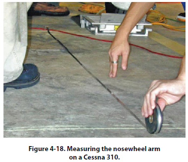 The arm for each of the weighing points is the distance from the center of the weight transfer point to the aircraft’s datum. If the arms are not known, based on previous weighing of the aircraft or some other source of data, they must be measured when the aircraft is weighed. This involves dropping a plumb bob from the center of each weighing point and from the aircraft datum, and putting a chalk mark on the hangar floor representing each point. The perpendicular distance between the datum and each of the weighing points can then be measured. In Figure 4-18, the distance from the nosewheel centerline to the datum is being measured on a Cessna 310 airplane. Notice the chalk lines on the hangar floor, which came as a result of dropping a plumb bob from the nosewheel axle centerline and from the datum. The nosewheel sitting on an electronic scale can be seen in the background.