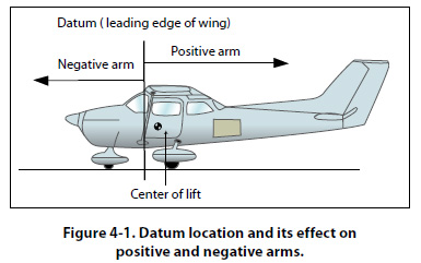 Weight and Balance TerminologyS Datum The datum is an imaginary vertical plane from which all horizontal measurements are taken for balance purposes, with the aircraft in level flight attitude. If the datum was viewed on a drawing or photograph of an aircraft, it would appear as a vertical line which is perpendicular (90 degrees) to the aircraft’s horizontal axis. For each aircraft make and model, the location of all items is identified in reference to the datum. For example, the fuel in a tank might be 60 inches (60") behind the datum, and a radio on the flight deck might be 90" forward of the datum. There is no fixed rule for the location of the datum, except that it must be a location that will not change during the life of the aircraft. For example, it would not be a good idea to have the datum be the tip of the propeller spinner or the front edge of a seat, because changing to a new design of spinner or moving the seat would cause the datum to change. It might be located at or near the nose of the aircraft, a specific number of inches forward of the nose, at the engine firewall, at the center of the main rotor shaft of a helicopter, or any place that can be imagined. The manufacturer has the choice of locating the datum where it is most convenient for measurement, equipment location, and weight and balance computation. Figure 4-1 shows an aircraft with the leading edge of the wing being the datum.