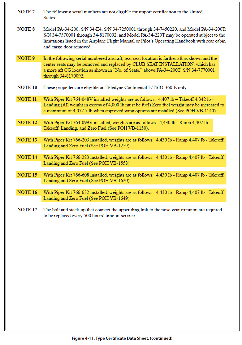 The document in Figure 4-11 is a Type Certificate Data Sheet (TCDS) for a Piper twin-engine airplane known as the Seneca (PA-34-200). The main headings for the information typically contained in a TCDS are included, but much of the information contained under these headings has been removed if it did not directly pertain to weight and balance. Information on only one model of Seneca is shown, because to show all the different models would make the document excessively long. The portion of the TCDS that has the most direct application to weight and balance is highlighted in yellow.