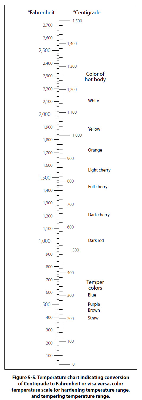 It is also possible to secure some idea of the temperature of a piece of carbon or low alloy steel, in the low temperature range used for tempering, from the color of the thin oxide film that forms on the cleaned surface of the steel when heated in this range. The approximate temperature/color relationship is indicated on the lower portion of the scale in Figure 5-5.