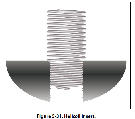 [Figure 5-31] They form unified coarse or unified fine thread classes 2-band 3B when assembled into (helicoil) threaded holes. The assembled insert accommodates UNJ (controlled radius root) male threaded members. Each insert has a driving tang with a notch to facilitate removal of the tang after the insert is screwed into a helicoil tapped hole.