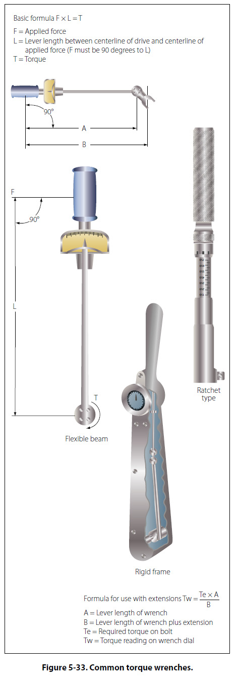 [Figure 5-33] When using the flexible beam and the rigid frame torque wrenches, the torque value is read visually on a dial or scale mounted on the handle of the wrench.