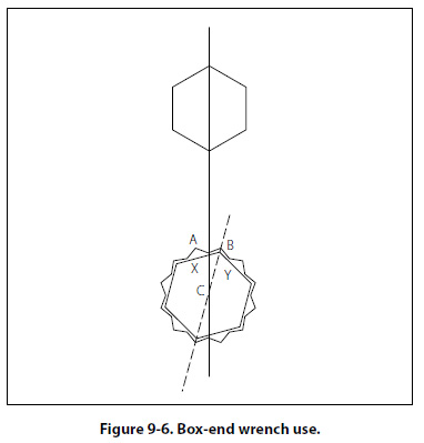 Box-end wrenches are popular tools because of their usefulness in close quarters. They are called box wrenches since they box, or completely surround, the nut or bolt head. Practically all well-manufactured box-end wrenches are made with 12 points so they can be used in places having as little as 15° swing. In Figure 9-6, point A on the illustrated double broached hexagon wrench is nearer the centerline of the head and the wrench handle than point B, and also the centerline of nut C. If the wrench is inverted and installed on nut C, point A will be centered over side “Y" instead of side “X." The centerline of the handle will now be in the dotted line position. It is by reversing (turning the wrench over) the position of the wrench that a 15° arc may be made with the wrench handle.