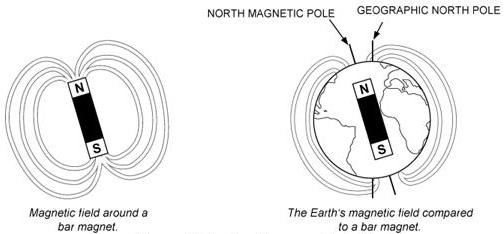 Since the magnetic compass works on the principle of magnetism, it is well for the pilot to have at least a basic understanding of magnetism. A simple bar magnet has two centers of magnetism which are called poles. Lines of magnetic force flow out from each pole in all directions, eventually bending around and returning to the other pole. The area through which these lines of force flow is called the field of the magnet.