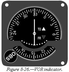 When the course selector is rotated, it moves the course deviation indicator or needle to indicate the position of the radial relative to the aircraft. If the course selector is rotated until the deviation needle is centered, the radial (magnetic course “FROM” the station) or its reciprocal (magnetic course “TO” the station) can be determined. The course deviation needle will also move to the right or left if the aircraft is flown or drifting away from the radial which is set in the course selector. By centering the needle, the course selector will indicate either the course “FROM” the station or the course “TO” the station. If the flag displays a “TO,” the course shown on the course selector must be flown to the station. If “FROM” is displayed and the course shown if followed, the aircraft will be flown away from the station. [Figure 8-26] |