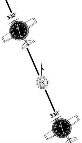 Keep in mind that the needle of fixed azimuth points to the station in relation to the nose of the aircraft. If the needle is deflected 30° to the left or a relative bearing of 330°, this means that the station is located 30° left. If the aircraft is turned left 30°, the needle will move to the right 30° and indicate a relative bearing of 0° or the aircraft will be pointing toward the station. If the pilot continues flight toward the station keeping the needle on 0°, the procedure is called homing to the station. If a crosswind exists, the ADF needle will continue to drift away from zero. To keep the needle on zero, the aircraft must be turned slightly resulting in a curved flightpath to the station. Homing to the station is a common procedure, but results in drifting downwind, thus lengthening the distance to the station.