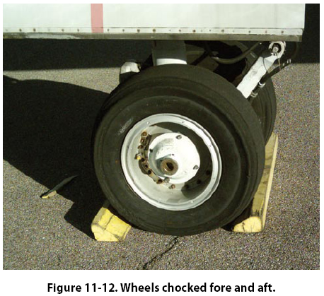 Securing Heavy Aircraft The normal tiedown procedure for heavy aircraft can be accomplished with rope or cable tiedown. The number of such tiedowns should be governed by anticipated weather conditions. Most heavy aircraft are equipped with surface control locks, which should be engaged or installed when the aircraft is secured. Since the method of locking controls will vary on different type aircraft, check the manufacturer’s instructions for proper installation or engaging procedures. If high winds are anticipated, control surface battens can also be installed to prevent damage. Figure 11-11 illustrates four common tiedown points on heavy aircraft.