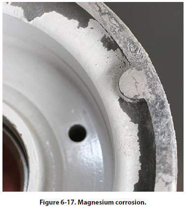 Corrosion of Magnesium Alloys Magnesium is the most chemically active of the metals used in aircraft construction and is the most difficult to protect. When a failure in the protective coating does occur, the prompt and complete correction of the coating failure is imperative if serious structural damage is to be avoided. Magnesium attack is probably the easiest type of corrosion to detect in its early stages, since magnesium corrosion products occupy several times the volume of the original magnesium metal destroyed. The beginning of attack shows as a lifting of the paint films and white spots on the magnesium surface. These rapidly develop into snow-like mounds or even “white whiskers." [Figure 6-17] Reprotection involves the removal of corrosion products, the partial restoration of surface coatings by chemical treatment, and a reapplication of protective coatings.