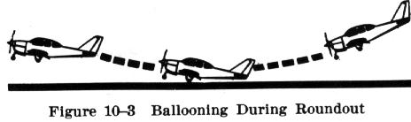 If the pilot misjudges the rate of sink during a landing and thinks the airplane is descending faster than it should, there is a tendency to increase the pitch attitude and angle of attack too rapidly. This not only stops the descent, but actually starts the airplane climbing. This climbing during the roundout is known as "ballooning" (Fig. 10-3). Ballooning can be dangerous because the height above the ground is increasing and the airplane may be rapidly approaching a stalled condition. The altitude gained in each instance will depend on the airspeed or the rapidity with which the pitch attitude is increased.