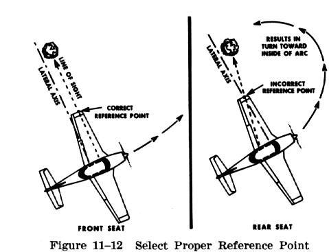 An explanation of the pivotal altitude is also essential. There is a specific altitude at which, when the airplane turns at a given groundspeed, a projection of the sighting reference line to the selected point on the ground will appear to pivot on that point. Since different airplanes fly at different airspeeds, the groundspeed will be different (Fig. 11-12). Hence, each airplane will have its own pivotal altitude. The pivotal altitude does not vary with the angle of bank being used unless the bank is steep enough to affect the groundspeed.