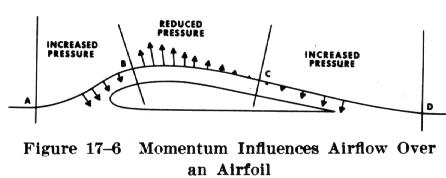 Bernoulli's principle of pressure by itself does not explain the distribution of pressure over the upper surface of the airfoil. To understand more fully, let us investigate the influence of momentum of the air as it flows in various curved paths near the airfoil (Fig. 17-6). Momentum is the resistance a moving body offers to having its direction or amount of motion changed. When a body is forced to move in a circular path it offers resistance in the direction away from the center of the curved path.