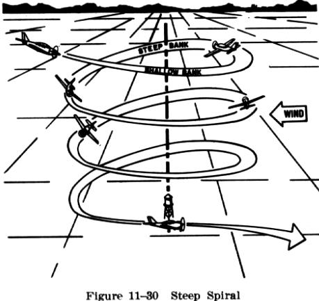 Operating the engine at idle speed for a prolonged period during the glide may result in excessive engine cooling or spark plug fouling. Therefore, the engine should be cleared periodically be briefly advancing the throttle to normal cruise power, while adjusting the pitch attitude to maintain a constant airspeed. Preferably, this should be done while headed into the wind to minimize any variation in groundspeed and radius of turn. After the throttle is closed and gliding speed is established, a gliding spiral should be started and a turn of constant radius maintained around the selected spot on the ground. This will require correction for wind drift by steepening the bank on downwind headings and shallowing the bank on upwind headings, just as in the maneuver "turns around a |
