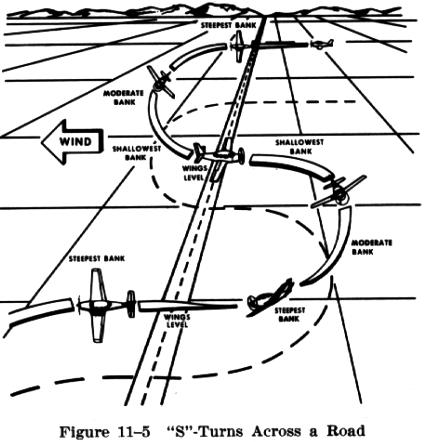 The objectives are to develop the ability to compensate for drift during turns, orient the flightpath with ground references, and divide the pilot's attention. The maneuver consists of crossing the road at a 90 degree angle and immediately beginning a series of 180 degree turns of uniform radius in opposite directions, recrossing the road at a 90 degree angle just as each 180 degree turn is completed. Since turns to effect a constant radius ground track require a changing roll rate and angle of bank to establish the crab needed to compensate for the wind, both will increase or decrease as groundspeed increases or decreases. |