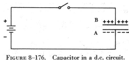 When a capacitor is connected across a source of direct current, such as a storage battery in the circuit shown in figure 8-176, and the switch is then closed, the plate marked B becomes positively charged, and the A plate negatively charged. Current flows in the external circuit during the time the electrons are moving from B to A. The current flow in the circuit is maximum the instant the switch is closed, but continually decreases thereafter until it reaches zero. The current becomes zero as soon as the difference in voltage of A and B becomes the same as the voltage of the battery. If the switch is opened, the plates remain charged. However, the capacitor quickly discharges when it is short circuited.