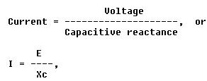 is similar to Ohm's law and the equation for current in an inductive circuit. The greater the frequency, the less the reactance. Hence, the capacitive reactance,