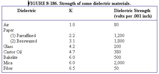 The voltage rating of the capacitor is a factor in determining the capacitance because capacitance decreases as the thickness of the dielectric increases. A high voltage capacitor that has a thick dielectric must have a larger plate area in order to have the same capacitance as a similar low voltage capacitor having a thin dielectric. The strength of some commonly used dielectric materials is listed in figure 8-186. The voltage rating also depends on frequency because the losses, and the resultant heating effect, increase as the frequency increases.