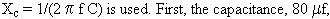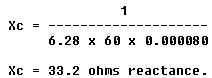 To find capacitive reactance, the equation  is changed to farads by dividing 80 by 1,000,000, since 1 million microfarads is equal to 1 farad. This quotient equals 0.000080 farad. This is substituted in the equation and