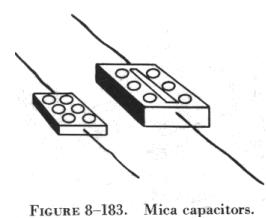 The fixed mica capacitor is made of metal foil plates that are separated by sheets of mica, which form the dielectric. The whole assembly is covered in molded plastic, which keeps out moisture. Mica is an excellent dielectric and will withstand higher voltages than paper without allowing arcing between the plates. Common values of mica capacitors range from approximately 50 micromicrofarads, to about 0.02 microfarads. Mica capacitors are shown in figure 8-183.