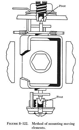 The moving element consists of a shaft with very hard pivot points to carry the moving coil or other movable element (figure 8-121). The pivot points are so fitted into highly polished jewels or very hard glass bearings that the moving element can rotate with very little friction.