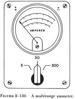 Ammeters having a number of internal shunts are called multirange ammeters. A scale for each range is provided on the meter face (figure 8-130). Some multimeters avoid internal switching through the use of external shunts. Changing ammeter ranges involves the selection and installation on the meter case of the proper size shunt.