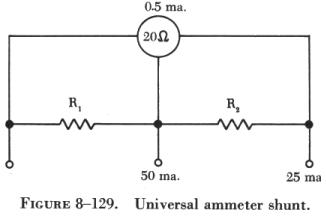 The schematic drawing in figure 8-129, the universal shunt, shows an arrangement whereby two or more ranges are provided by tapping the shunt resistor at the proper points. In this arrangement, a 0 - 5 ma. movement with a resistance of 20 ohms is shunted to provide a 0 - 25 ma. range and a 0 - 50 ma. range.