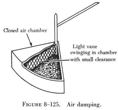 Air damping is a common method of damping by mechanical means. As shown in figure 8-125, a vane is attached to the shaft of the moving element and enclosed in an air chamber. The movement of the shaft is retarded because of the resistance which the air offers to the vane. Effective damping is achieved if the vane nearly touches the walls of the chamber.
