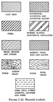 Section line symbols show the kind of material from which the part is to be constructed. The material may not be indicated symbolically when its exact specification must also be shown elsewhere on the drawing. In this case, the more easily drawn symbol for cast iron is used for the sectioning, and the material specification is listed in the bill of materials or indicated in a note. Figure 2-22 illustrates a few standard material symbols.