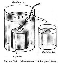 The following experiment is illustrated in figure 7-4. The overflow can is filled up to the spout with water. The heavy metal cylinder is first weighed in still air and then is weighed while completely submerged in the water. The difference between the two weights is the buoyant force of the water. As the cylinder is lowered into the overflow can, the water is caught in the catch bucket. The volume of water which overflows equals the volume of the cylinder. (The volume of irregular shaped objects can be measured by this method.) If this experiment is performed carefully, the weight of the water displaced by the metal cylinder exactly equals the buoyant force of the water.