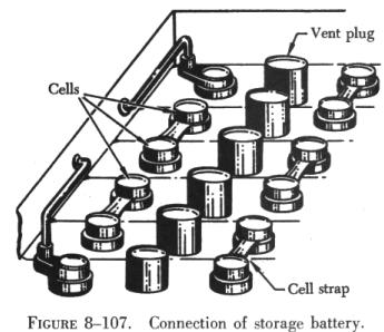 Additionally, a cell approaching a state of total discharge is of little use because the high internal resistance (IR) caused by the sulfate coatings on its plates reduces the current to a value too low for practical use. When a cell is being charged, lead sulfate is removed from both the positive and negative plates, and sulfuric acid is again formed. In the process, the water content of the electrolyte is decreased and the density of the electrolyte is increased. The open circuit voltage of a lead-acid cell, that is, its voltage when there is no load drawing current, is approximately 2.2 volts. This voltage is the same for every lead-acid cell regardless of its plate size and remains at this value until the cell is practically dead, regardless of its state of discharge. When the cell approaches total discharge, its voltage begins to drop rapidly. The closed circuit voltage of a cell, that is, its voltage under load, decreases gradually as the cell is discharged. This gradual decrease in terminal voltage is due to a gradual increase in the internal resistance of the cell caused by sulphation of the plates. At the end of normal discharge, the internal resistance of a lead-acid cell is more than twice as high as it is when fully charged. The difference between the open circuit and closed circuit terminal voltages is due to the voltage drop inside the cell. This is equal to the current the load draws multiplied by the internal resistance in the cell. Therefore, the discharging voltage that a lead-acid cell can supply under closed circuit conditions is equal to the open circuit voltage of the cell minus the IR drop in the cell. To give a high discharge current and a high terminal voltage under load, a battery must have low internal resistance. This characteristic can be achieved through extensive plate area. Therefore, each cell contains several sets of plates. All the positive plates of a cell are connected by one connecting bar, and all the negative plates by another. Thus, the plates are connected in parallel, further decreasing the internal resistance of the cell. The open circuit cell voltage is not affected; it remains the same as that of a single pair of plates. Lead-Acid Battery Ratings The voltage of a battery is determined by the number of cells connected in series to form the battery. Although the voltage of one lead-acid cell just removed from a charger is approximately 2.2 volts, a lead-acid cell is normally rated at only 2 volts, because it soon drops to that value. A battery rated at 12 volts consists of 6 lead-acid cells connected in series, and a battery rated at 24 volts is composed of 12 cells. The capacity of a storage battery is rated in ampere-hours (amperes furnished by the battery times the amount of time current can be drawn). This rating indicates how long the battery may be used at a given rate before it becomes completely discharged. Theoretically, a 100 ampere-hour battery will furnish 100 amperes for 1 hour, 50 amperes for 2 hours, or 20 amperes for 5 hours. Actually, the ampere-hour output of a particular battery depends on the rate at which it is discharged. Heavy discharge current heats the battery and decreases its efficiency and total ampere-hour output. For airplane batteries, a period of 5 hours has been established as the discharge time in rating battery capacity. However, this time of 5 hours is only a basis for rating and does not necessarily mean the length of time during which the battery is expected to furnish current. Under actual service conditions, the battery can be completely discharged within a few minutes, or it may never be discharged if the generator provides sufficient charge. The ampere-hour capacity of a battery depends upon its total effective plate area. Connecting batteries in parallel increases ampere-hour capacity. Connecting batteries in series increases the total voltage but not the ampere-hour capacity. In multiengine airplanes, where more than one battery is used, the batteries are usually connected in parallel. The voltage is equal to that of one battery, but the ampere-hour capacity is increased. The total capacity is the sum of the ampere-hour ratings for the individual batteries. Factors Affecting Lead-Acid Battery Life Various factors cause deterioration of a battery and shorten its service life. These include over discharging, which causes excess sulphation and too rapid charging or discharging, resulting in overheating of the plates and shedding of active material. The accumulation of shedded material, in turn, causes shorting of the plates and results in internal discharge. A battery that remains in a low or discharged condition for a long period of time may be permanently damaged. In addition to causing deterioration of the battery, these factors also decrease battery capacity. Lead-Acid Battery Testing Methods The state of charge of a storage battery depends upon the condition of its active materials, primarily the plates. However, the state of charge of a battery is indicated by the density of the electrolyte and is checked by a hydrometer, an instrument which measures the specific gravity (weight as compared with water) of liquids. The hydrometer commonly used consists of a small sealed glass tube weighted at its lower end so it will float upright, as shown in figure 8-109. Within the narrow stem of the tube is a paper scale with a range of 1.100 to 1.300. When a hydrometer is used, a quantity of electrolyte sufficient to float the hydrometer is drawn up into the syringe. The depth to which the hydrometer sinks into the electrolyte is determined by the density of the electrolyte, and the scale value indicated at the level of the electrolyte is its specific gravity. The more dense the electrolyte, the higher the hydrometer will float; therefore, the highest number on the scale (1.300) is at the lower end of the hydrometer scale. In a new, fully charged aircraft storage battery, the electrolyte is approximately 30 per