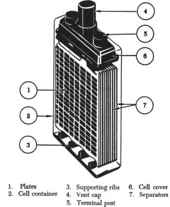 Each cell is seated in a hard rubber casing through the top of which are terminal posts and a hole into which is screwed a nonspill vent cap (4). The hole provides access for testing the strength of the electrolyte and adding water. |