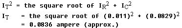 | The methods used in solving parallel ac circuit problems are basically the same as those used for series ac circuits. Out of phase voltages and currents can be added by using the law of right triangles, but in solving circuit problems, the currents through the branches are added, since the voltage drops across the various branches are the same and are equal to the applied voltage. In figure 8-193, a parallel ac circuit containing an inductance and a resistance is shown schematically. The current flowing through the inductance, IL, is 0.0584 ampere, and the current flowing through the resistance is 0.11 ampere. What is the total current in the circuit? |