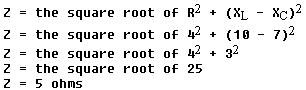 What is the impedance of a series circuit (figure 8-192), consisting of a capacitor with a reactance of 7 ohms, an inductor with a reactance of 10 ohms, and a resistor with a resistance of 4 ohms?
