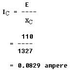 In figure 8-191, a series circuit is illustrated in which a capacitor of 200 mf is connected in series with a 10 ohm lamp. What is the value of the impedance, the current flow, and the voltage drop across the lamp? |