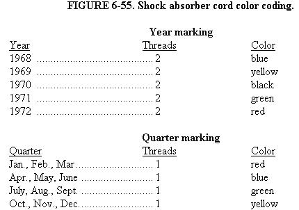 Three colored threads are braided into the outer cover for the entire length of the cord. Two of these threads are of the same color and represent the year of manufacture; the third thread, a different color, represents the quarter of the year in which the cord was made. The code covers a 5 year period and then repeats itself. This makes it easy to figure forward or backward from the years shown in figure 6-55.