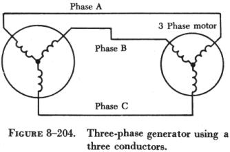 In combination, all four wires can furnish power at 208 volts, three phase, for operating three phase equipment, such as three phase motors or rectifiers. When only three phase equipment is used, the ground wire may be omitted. This leaves a three phase, three wire system as illustrated in figure 8-208.