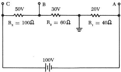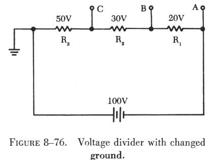 When the current reaches tap B, 30 more volts have been used to move the electrons through R2, and in a similar manner the remaining 50 volts are used for R3. But the voltages across R2 and R3 are positive voltages, since they are above ground potential. Figure 8-76 shows the voltage divider used previously. The voltage drops across the resistances are the same; however, the reference point (ground) has been changed. The voltage between ground and tap A is now a negative 100 volts, or the applied voltage. The voltage between ground and tap B is a negative 80 volts, and the voltage between ground and tap C is a negative 50 volts. |