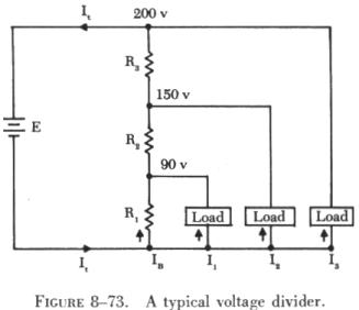 A voltage divider usually consists of a resistor, or resistors connected in series, with fixed or movable contacts and two fixed terminal contacts. As current flows through the resistor, different voltages can be obtained between the contacts. A typical voltage divider is shown in figure 8-72. A load is any device which draws current. A heavy load means a heavy current drain. In addition to the current drawn by the various loads, there is a certain amount drawn by the voltage divider itself. This is known as bleeder current. |