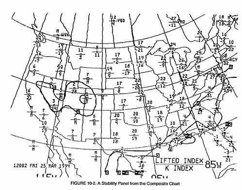 The stability panel, the upper left panel of the chart, outlines areas of stable and unstable air. Figure 10-2 shows the two stability indices that are computed for each upper air station. The top value is the lifted index and is plotted above a short line, below the line is the K index. An "M" indicates the value is missing.