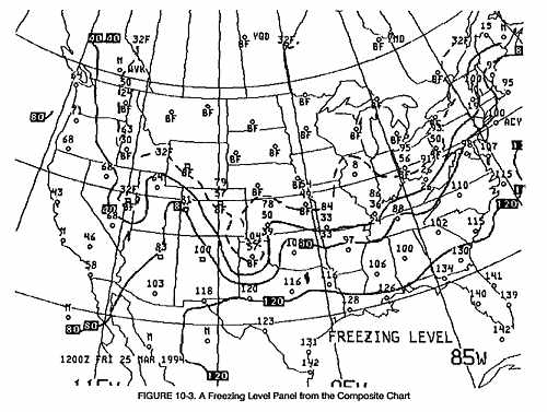 Plotted multiple crossings of the zero degree Celsius isotherm always show an inversion with warm air above subfreezing temperatures (Table 10-3). This situation can produce very hazardous icing when precipitation is occurring. Airmet ZULU (Section 4) shows more specifically the areas of expected icing. The low-level significant weather prog shows anticipated changes in the freezing level.