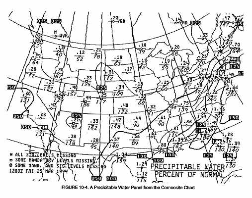 The precipitable water panel, the upper right panel of the chart, is an analysis of the water vapor content from the surface to the 500 mb/hPa level (Figure 10-4). The amount of water vapor observed is shown as precipitation water, which is the amount of liquid precipitation that would result if all the water vapor were condensed.