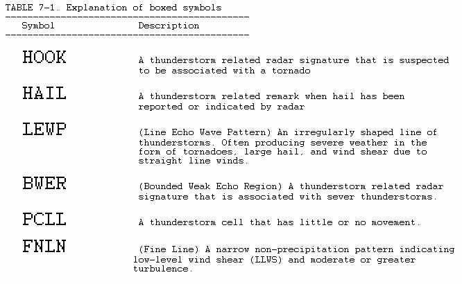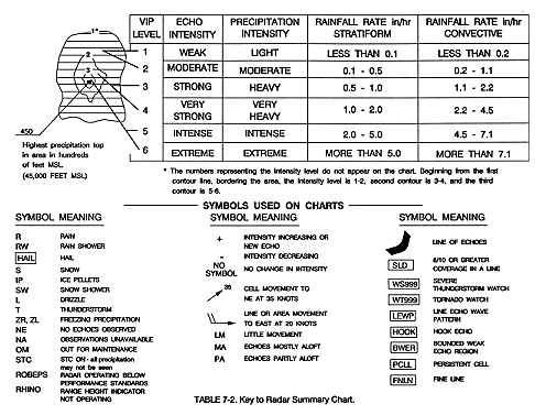 The intensity is obtained from the Video Integrator Processor (VIP) and is indicated on the chart by contours. The six VIP levels are combined into three contours as indicated in Table 7-2. In Figure 7-1 over southwest Nebraska and northwest Kansas, there is an area of precipitation depicted by one contour. The area would have an intensity of VIP level 1 and possibly VIP level 2. Whether there is a VIP level 2 in the area cannot be determined. However, what can be said is that the maximum intensity is definitely below VIP level 3. When determining intensity levels from this chart, it is recommended that the maximum possible intensity be used. To determine the actual maximum VIP level, the radar weather report (SD) for that time period should be examined.