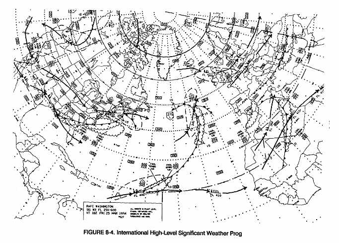 Figure 8-4 is an example of the High Level Significant Weather prog chart for international flights between the U.S. and Europe and northern Africa. It basically has the same information and notation as the domestic High Level Significant Weather prog. It is for flights between 25,000 feet and 60,000 feet pressure altitude and is on a polar map projection. Referring to Figure 8-4, the legend shows NMC as a Regional Area Forecast Center (RAFC) and the originator of this significant weather prog. The valid time of this particular prog is 18Z on March 25, 1994.