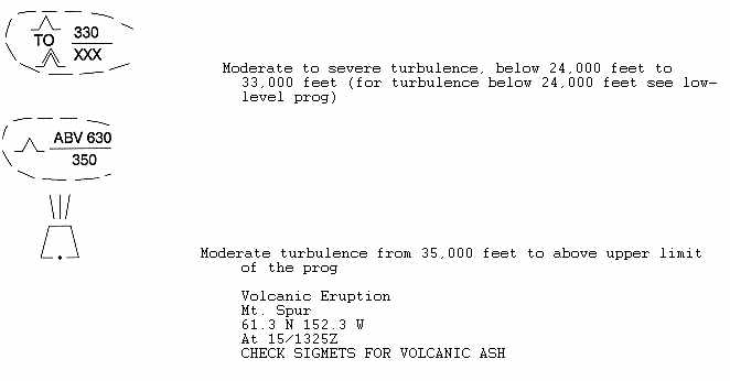 Turbulence - Areas of forecast moderate or greater clear air turbulence (CAT) are bounded by heavy, dashed lines. Clear air turbulence includes all turbulence (wind shear induced and mountain wave induced) not caused by convective activity. Areas are labeled with appropriate turbulence symbol (Table 8-1) and the vertical extent in hundreds of feet MSL.