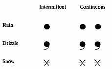 NOTE: Character of stable precipitation is the manner in which it occurs. It may be intermittent or continuous. A single symbol denotes intermittent and a pair of symbols denotes continuous.