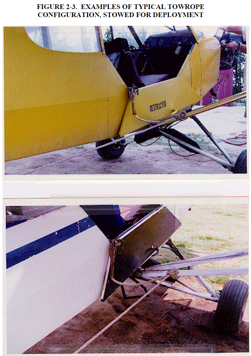 CHAPTER 2. EQUIPMENT AND OPERATION SAFETY ISSUES BANNER PICKUP. The banner pickup is the most critical portion of a banner tow operation. A typical flight begins by taking off with the grapple hook assembly stowed. Upon reaching a safe altitude, the pilot will deploy the grapple hook and allow it to trail aft of the aircraft. See Figure 2-3, Examples of Typical Towrope Configuration, Stowed for Deployment. ![]() A shallow approach is conducted perpendicular to the pickup-masts in an effort to snag the towline loop with the grapple hook. As the masts are reached, the airplane is rotated into a steep climb to assure the banner will be peeled off the ground instead of jerked off at an acute angle, depending upon aircraft performance capabilities. As the banner is peeled off the ground, back pressure is gradually reduced until the airplane is climbing at a normal angle with the banner in tow. The approach to the pickup-masts should be flown appropriate to the performance characteristics of the aircraft. Care must be taken to avoid snagging the towline with the airframe. An approach that is both too low and too slow may result in the grapple hook bouncing off the ground. The length ofthe grapple hook and line assembly should be limited to a length that will not allow the hook to strike the cockpit area of the airplane if it should come up over the fuselage. Grapples contacting a hard surface have been known to bounce upward and forward, over the airplane, snarling the horizontal stabilizer or a wing. Stalls during the banner pickup procedure constitute one of the more frequent causes of banner tow operational accidents. A stall occurs when an airfoil reaches a critical angle of attack and is a function of wing loading, independent of airspeed. In fact, an excessively abrupt rotation of an airplane during a pickup, or a snap or steep turn after a missed pickup, may be sufficient to precipitate an accelerated stall. NOTE: The formula for stall is the square root of the load factor times the normal stall speed. Gradually reducing back pressure while in the climb as the banner is picked up increases the margin from the stall threshold by decreasing the wing loading and consequently the angle of attack. FLYING WITH A BANNER IN TOW. The accidental release of a banner in flight may not be hazardous to the tow plane or crew but it may pose a threat to people and property on the surface. Banner towlines should be examined carefully for flaws before each towing day. Grapple hooks should also be examined for cleanliness and smoothness. Any surface irregularities on a hook can act as an abrasive and degrade the towline loop during the pickup as the line moves laterally over the hook while tension on the line is increased. Whenever possible, banner material and lines should be of non-conductive material. This reduces the risk of shorting out power lines in the case where a banner is released over power lines by accident. LANDING WITH BANNER IN TOW. Should a malfunction make it impossible to release the banner, it is generally uneventful if a hard surface runway is used. However, a special technique can be used if the landing is attempted on a sod or dirt runway. If the masthead and banner lay down on the sod runway, each blade of grass folds over the mast and each individual letter pole on lettered banners causes drag. The pilot needs to be aware that the masthead may dig into the soft turf like an anchor, stretching the tow line, and sometimes breaking it. If the tow line breaks, the sudden release of energy will cause the airplane to pitch down and a nose over condition may occur. This condition can be countered by maintaining back pressure on the flight controls and adding full power once the drag caused by the masthead is experienced. After the airplane is again stabilized, the power is reduced. MULTIPLE TOW HITCHES. When multiple tow hitches are used, an airplane may tow a succession of banners without having to land and reinstall a grapple line after every drop. A bank of as many as four or five tow hitches may be installed on the aircraft and a grapple line is affixed to each. These lines are stowed within reach of the pilot in the same manner as previously discussed. Care must be taken to prevent multiple lines from tangling, and since the pilot will be confronted by a multitude of grapples and hitch releases, each line and release should be positively matched to prevent confusion in the event of an emergency. The length of flights and fuel consumption should be considered in determining how many hooks will be added to a multiple tow hitch. See Figure 2-4, Examples of Multiple Grapple Hook Installation. ![]() |
